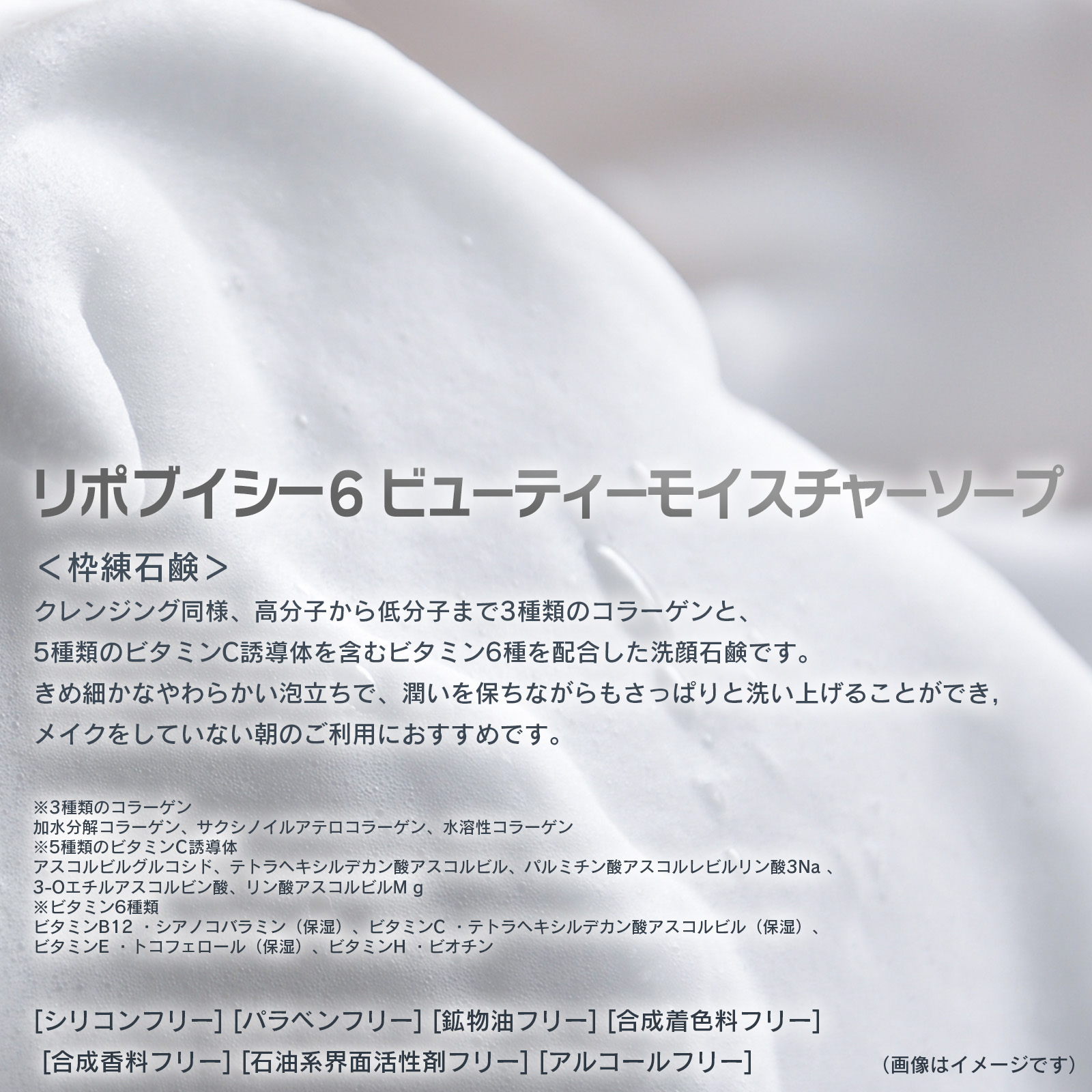 LYPO Vc6 ビューティモイスチャーソープは、3種のコラーゲンと5種類のビタミンC誘導体、6種の美容ビタミン※1を整肌成分として配合した高保湿洗顔石鹸です。きめ細かな泡立ちで、肌のうるおいを保ちながら汚れをすっきりと洗い上げます。朝の洗顔やノーメイク時にもやさしい使用感です。製品の特徴(詳細)