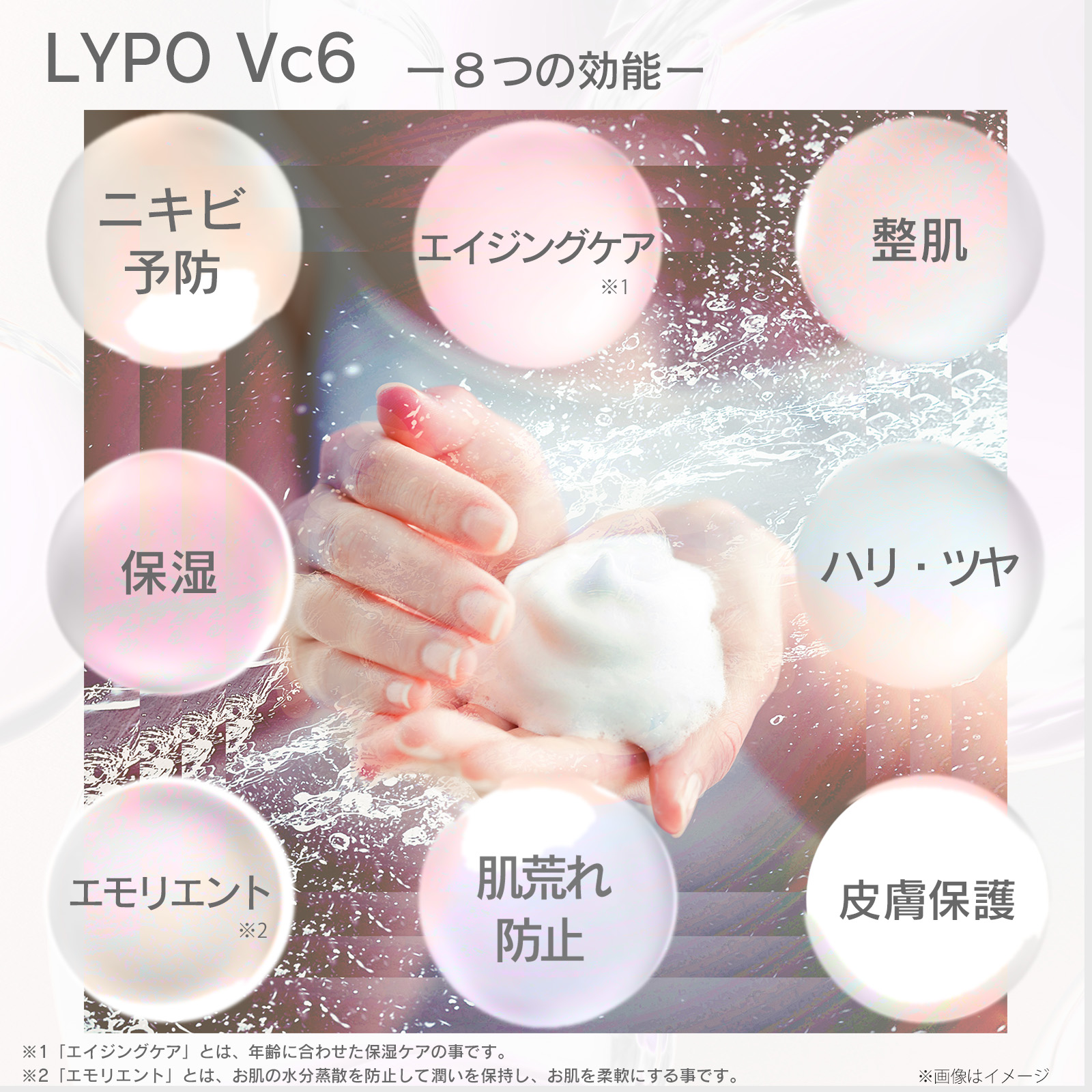 LYPO Vc6 ソープは、うるおいを守りながら汚れをすっきり洗えるバランスにこだわった洗顔ソープです。濃密な泡がクッションとなり、摩擦を抑えてやさしく洗い上げます。5種のビタミンC誘導体※1と6種の美容ビタミン※2を整肌成分として配合し、洗うたびになめらかで均一な肌印象へ導きます。ポイント