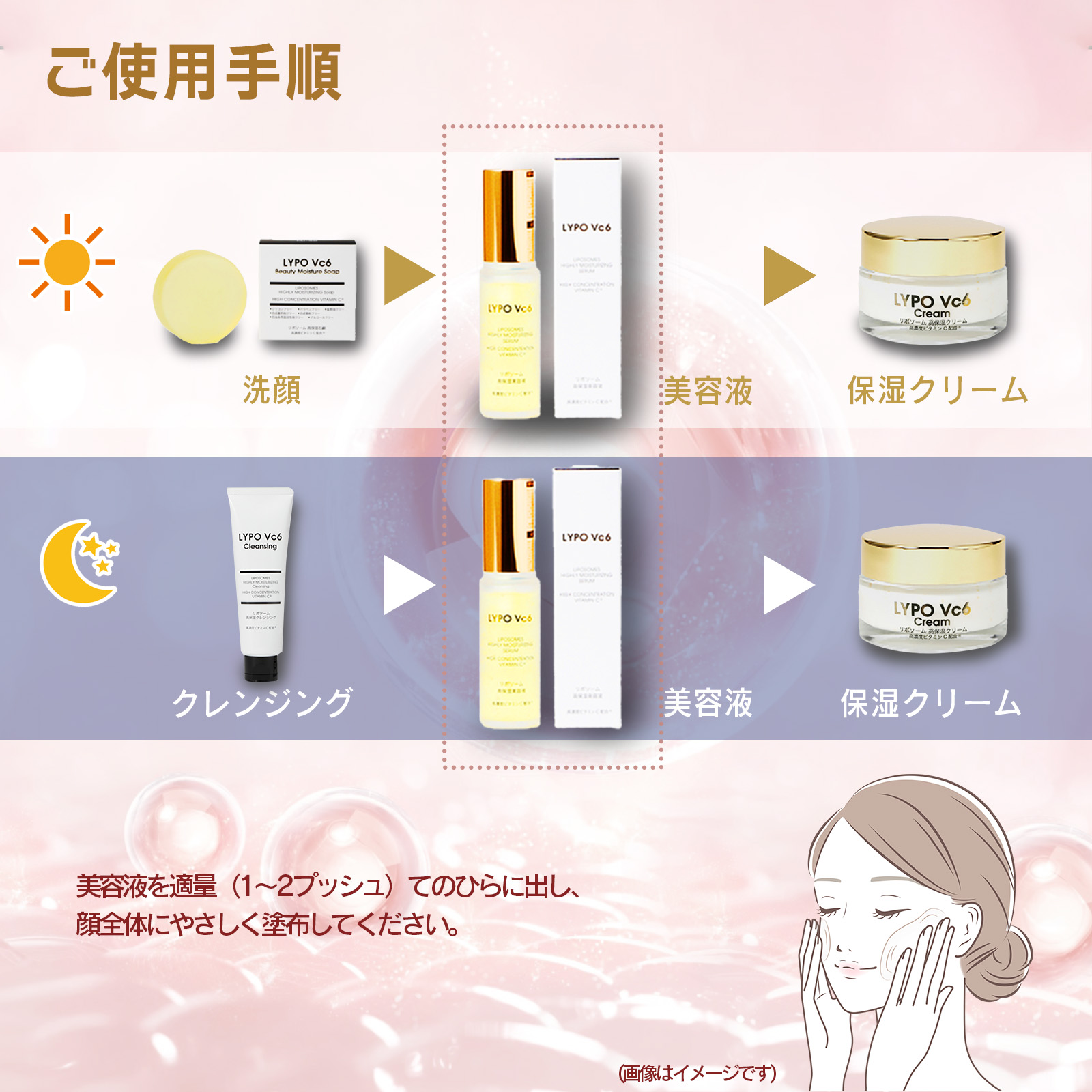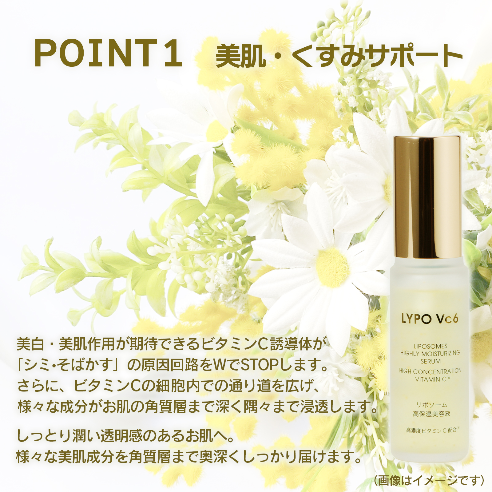 LYPO Vc6 美容液は、年齢による乾燥やハリ不足に寄り添い、うるおいに満ちた肌を目指すスキンケア美容液。5種のビタミンC誘導体※1と6種の美容ビタミン※2、エイジングケア成分※3、3種のセラミド※4をバランスよく整肌成分として配合し、角質層まで届く処方で肌をすこやかに整えます。