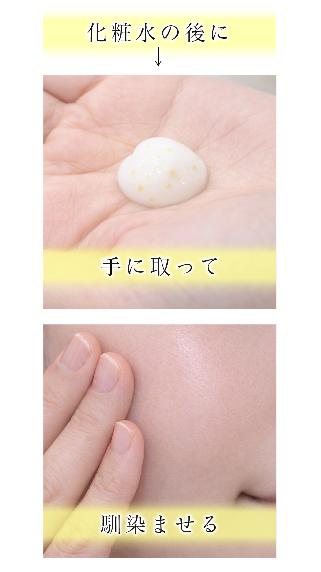 スキンケアの最後に適量を顔全体にやさしくなじませてください。乾燥が気になる部分には重ね付けもおすすめです。